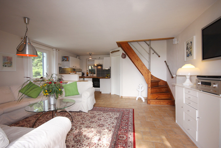 Der Wohnraum im Erdgeschoss überzeugt mit einer gemütlichen Sitzecke. LCD-TV-Sat, Sat-Radio, Festplattenrekorder, BOSE-Soundsystem, integrierter Küchenzeile (mit Geschirrspüler, Ceranherd mit Backofen, Mikrowelle, Toaster, Kühl- Gefrierkombination, Kaffeemaschine, Wasserkocher) und kleinem Essbereich. Außerdem befinden sich hier das Bad mit Dusche, WC sowie mit Waschtrockner. Eine steile Treppe führt ins Dachgeschoss.